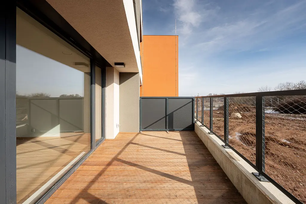Mezonetový byt o výměře 114,10 m² disponuje v 1. NP garážovým stáním, technickou místností a vstupem do bytu. Ve 2. NP je situován prostorný obývací pokoj, samostatná kuchyně s jídelnou a koupelna s WC a sprchovým koutem. Ve třetím patře jsou pak umístěny 2 pokoje a ložnice, další koupelna s WC a vanou a útulná zastřešená lodžie. V každé bytové jednotce je systém vytápění zajištěn řízeným větráním s tepelnou úpravou vzduchu v kombinaci s topnými foliemi v podlaze a o systém větrání se stará řízené větrání VZT s rekuperací a úpravou vzduchu - zdroj tepelné čerpadlo, s centrálním ovládáním a možností lokální manuální regulace průtoku vzduchu.