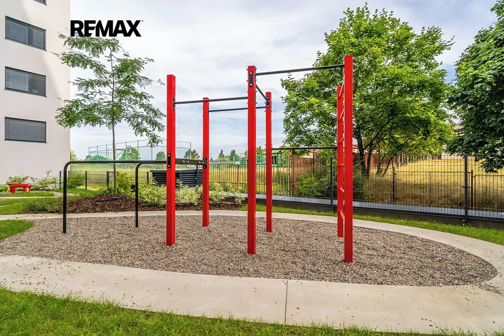 Součástí domu je však i venkovní workoutové hřiště (pro dospělé) v přízemí na severní straně a příjemná venkovní terasa v 10. patře.
