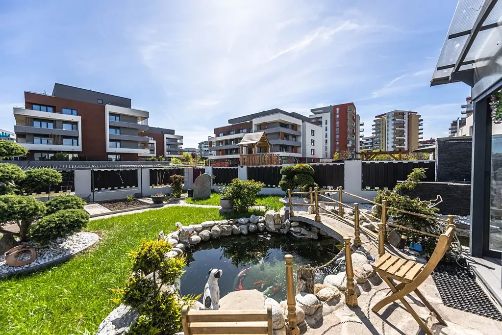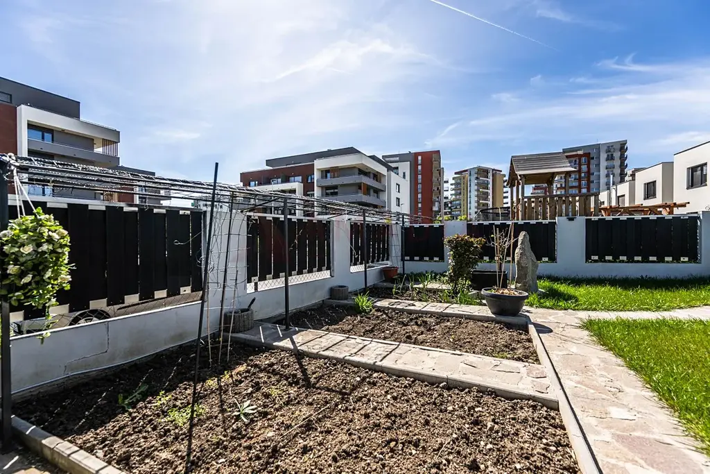 Na oploceném pozemku je upravená zahrada s jezírkem, vzrostlou zelení, zpevněnými chodníky a zahradním domkem. Před domem jsou k dispozici další dvě parkovací stání na vlastním pozemku.