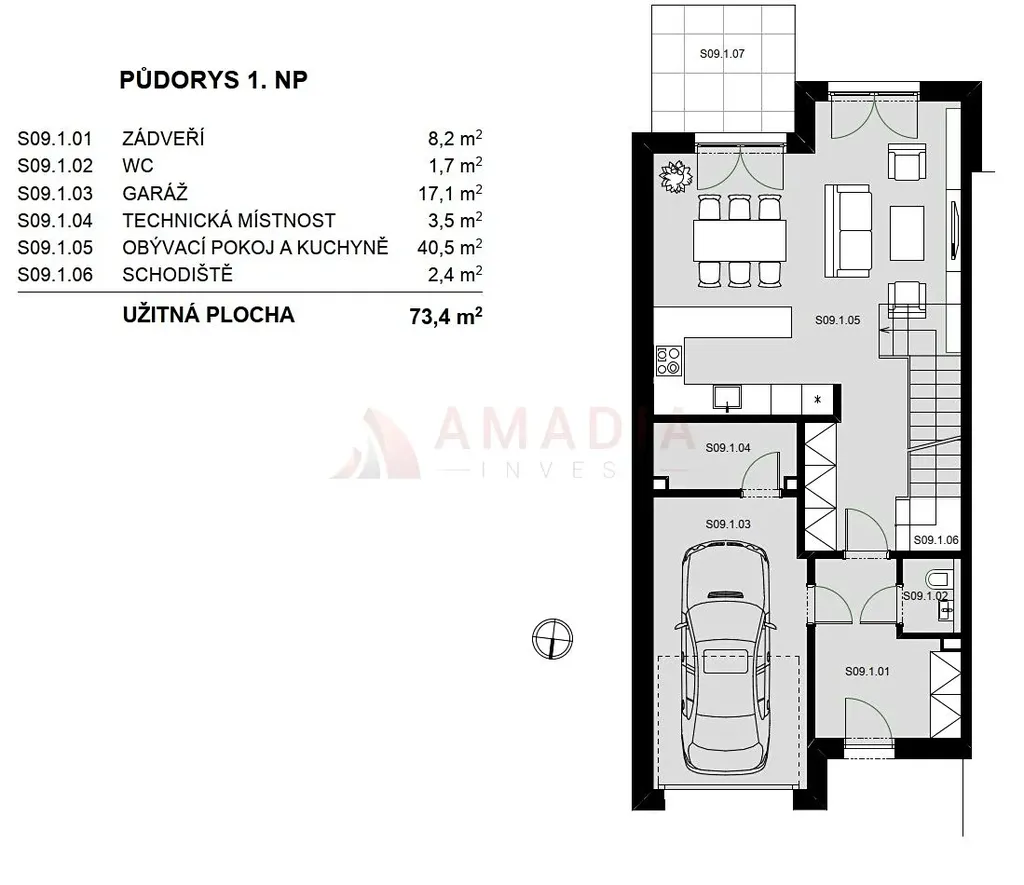 V přízemí se nachází zádveří, samostatné WC, garáž, technická místnost a prostorný obývací pokoj s kuchyňským koutem a vstupem do zimní zahrady.