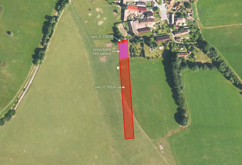 Dle aktuálního plánu obce leží tyto parcely ve stavební ploše. Větší z parcel - č. 765/8 - je nyní vedena jako orná půda a užívána jako trvalý travní porost. Její výměra je 4 410 m2 a z toho 660 m2 je současně v ploše smíšené obytné venkovské. Hlavní užití je vymezeno pro polyfunkční využití zahrnující bydlení v rodinných domech a občanské vybavení lokálního a regionálního významu. Vznikat tak zde může v budoucnu široká škála objektů.