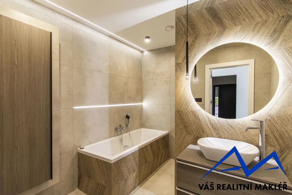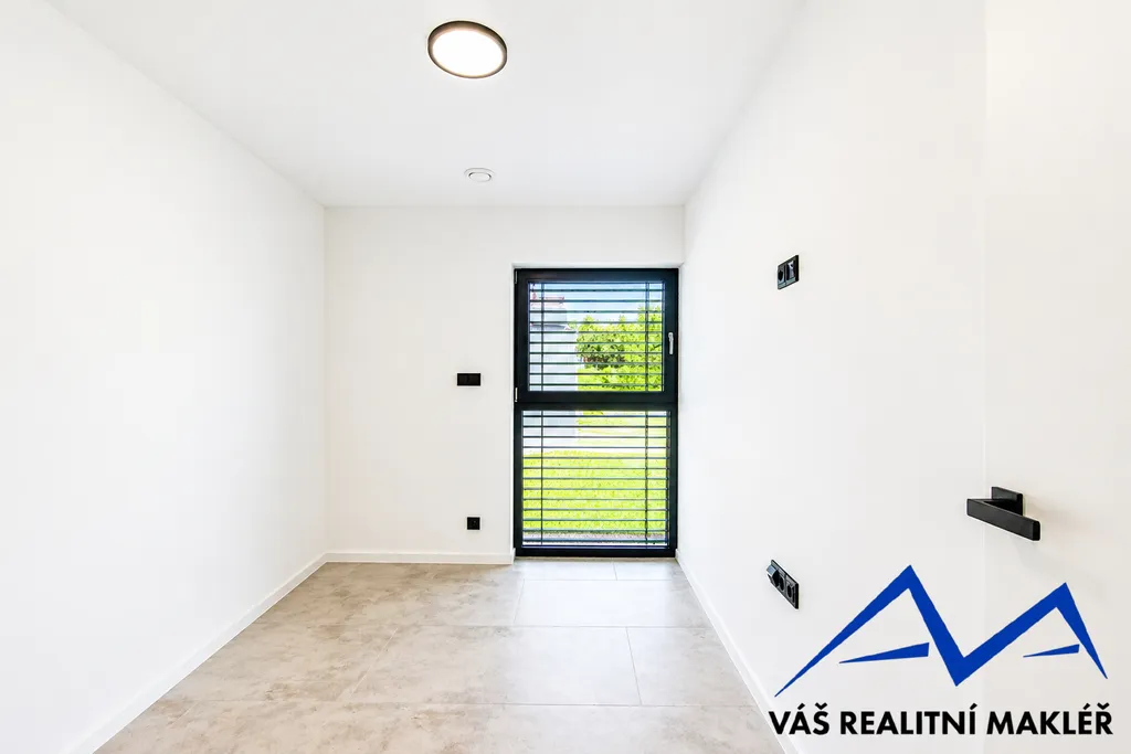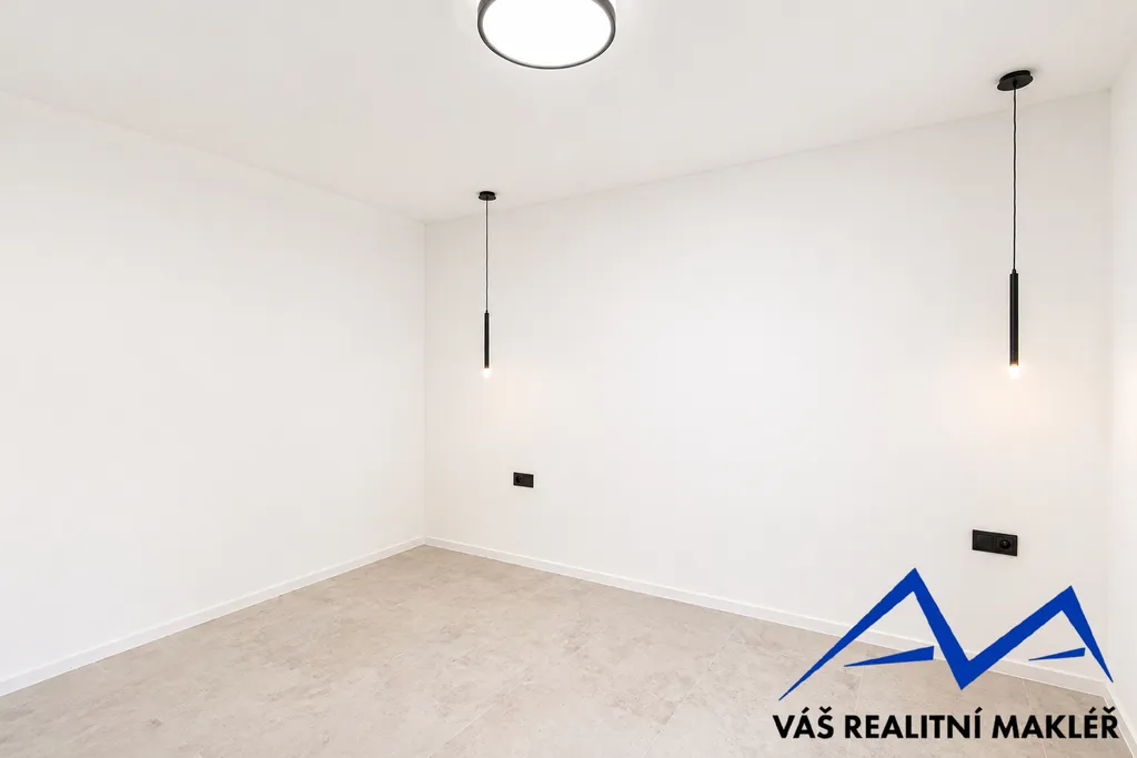 Interiér domu je kompletně dokončen – v ceně jsou podlahy, koupelna se sprchovým koutem i vanou, samostatné WC, interiérové dveře i osvětlení. Kuchyňská linka není součástí, což dává novému majiteli možnost realizace dle vlastních představ.