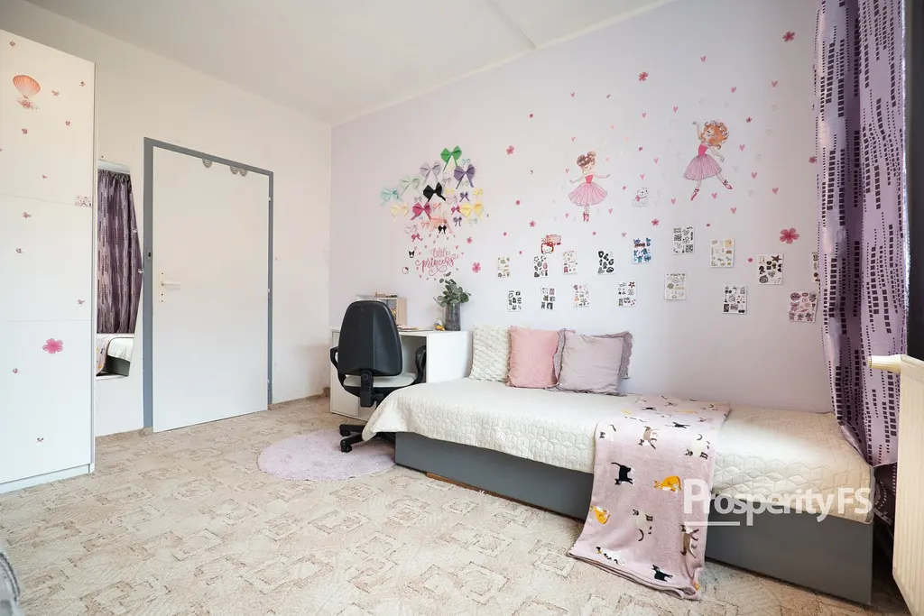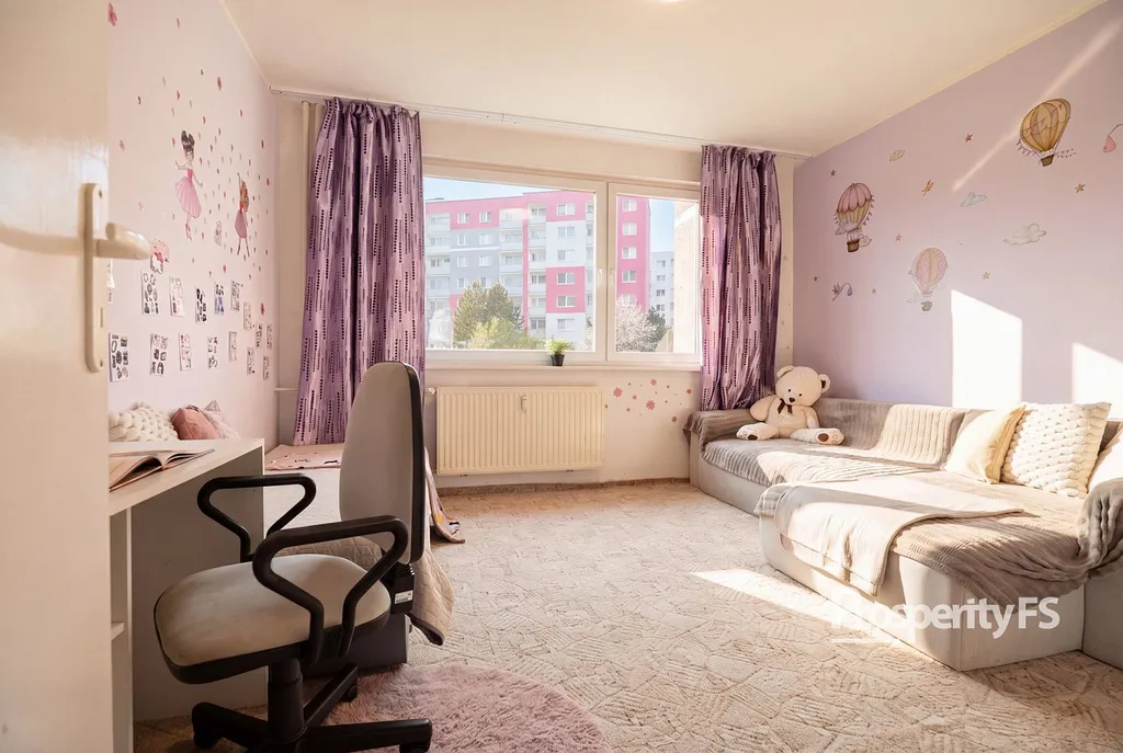 Dispoziční řešení bytu zahrnuje vstupní chodbu, prostorný obývací pokoj se vstupem na lodžii, kuchyň, jeden dětský pokoj, ložnici, koupelnu a samostatné WC. Velkou výhodou bytu je lodžie s příjemným výhledem na okolní přírodu, která nabízí klidné místo k odpočinku.