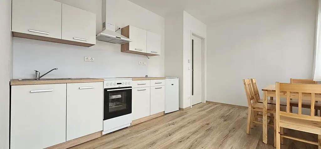 Bytová jednotka je kompletně nová a vybavená kuchyňskou linkou se spotřebiči (elektrický sporák se sklokeramickou deskou, lednice s mrazákem, digestoř). Součástí kuchyně je také jídelní stůl.