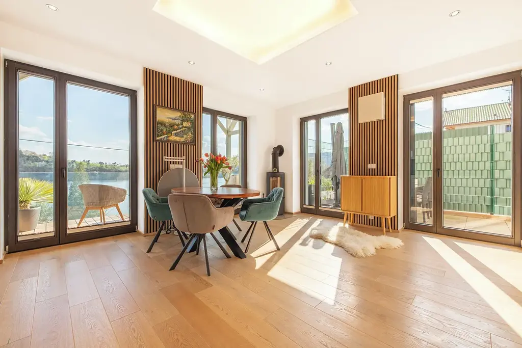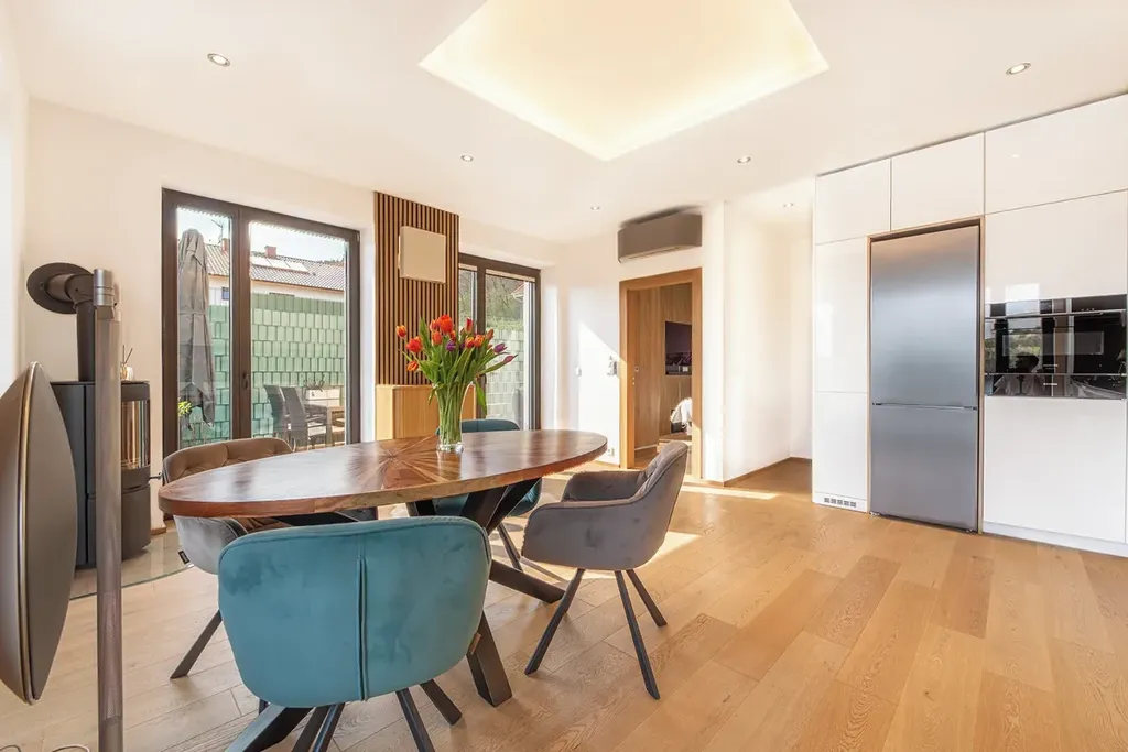 Kvalita bez kompromisů: Masivní dřevěné podlahy, trojitá dřevohliníková okna, inteligentní rekuperace Recuair a elektrické venkovní žaluzie.