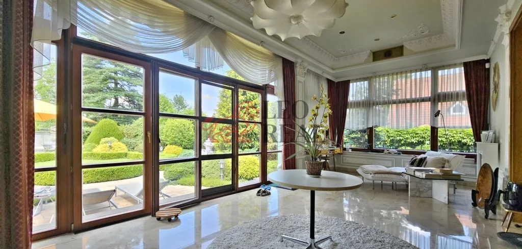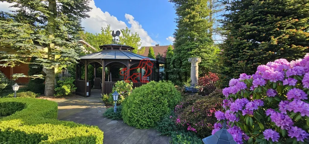 Zahrada je navržena ve stylu francouzské zahradní architektury s množstvím vzrostlých stromů a okrasných dřevin. Atmosféru dotvářejí pískovcové chodníčky, originální skulptury a stylové lampy pro noční osvětlení. Pískovcová kašna a altán dotvářejí ráz této zahrady, plné romantických zákoutí a ptačího zpěvu. O zavlažování se stará automatický závlahový systém napojený na vlastní 17 metrů hlubokou studnu s dostatkem vody, na kterou lze v případě potřeby alternativně připojit i celý dům.