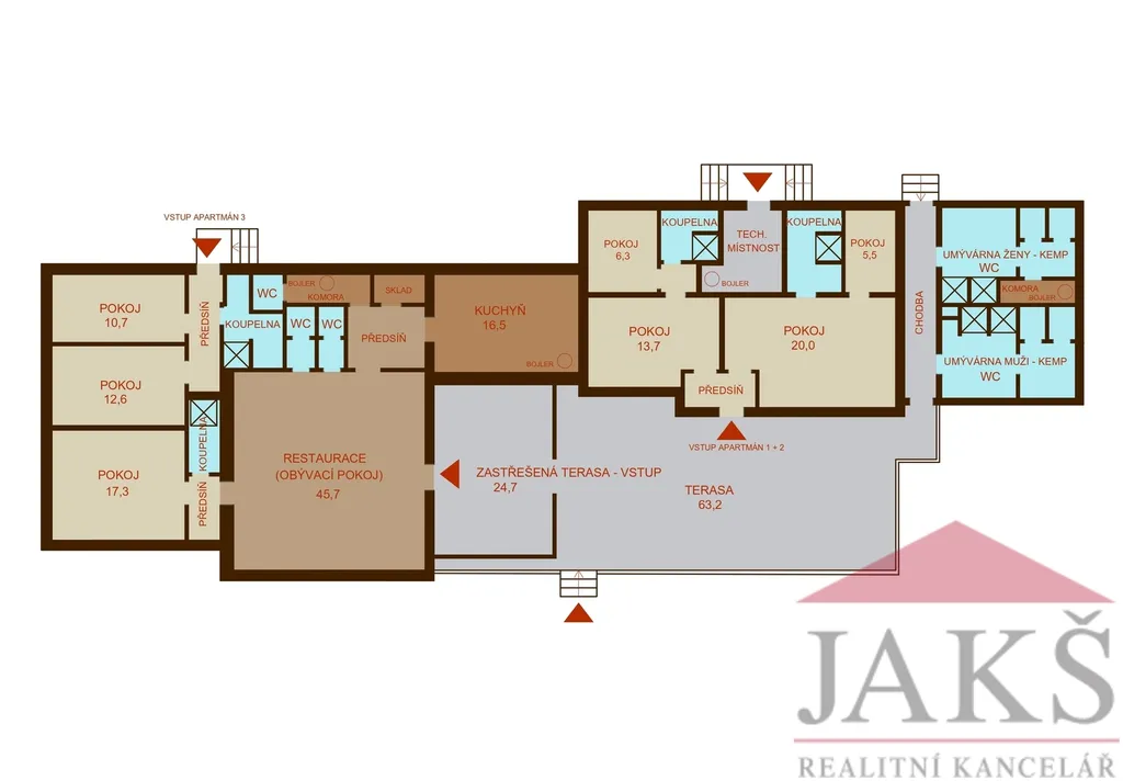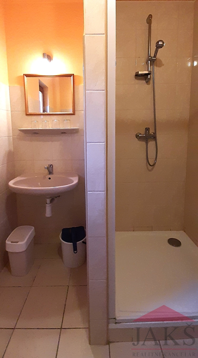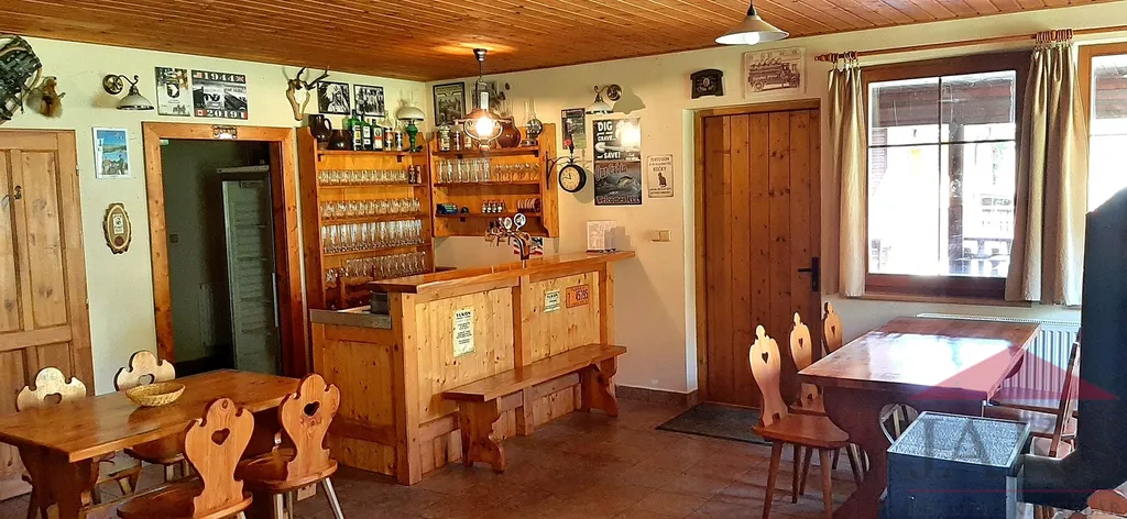 Popis: chladný sklep, pivo sudy 15 m2; přízemí 234 m2: vstup přes velkou částečně zastřešenou terasu 87 m2; stylová restaurace - pivnice 46 m2 (výčep, krbová kamna, WC) vybavená kuchyň s digestoří 17 m2; apartmán č.1 (2+kk, 25 m2); apartmán č.2 (2+kk, 30 m2) oba přístupné z terasy; apartmán č.3 (2+kk; 33,4 m2) vlastní vstup; apartmán č.4 (1+kk; 22 m2; byt správce vstup z restaurace), kotelna; sociální zařízení pro kemp 42 m2 s vlastním vstupem, které lze upravit na další apartmán. Objekt je na betonovém, vyvýšeném soklu cca 80 cm, chráněný před záplavami, vč. 100leté vody.