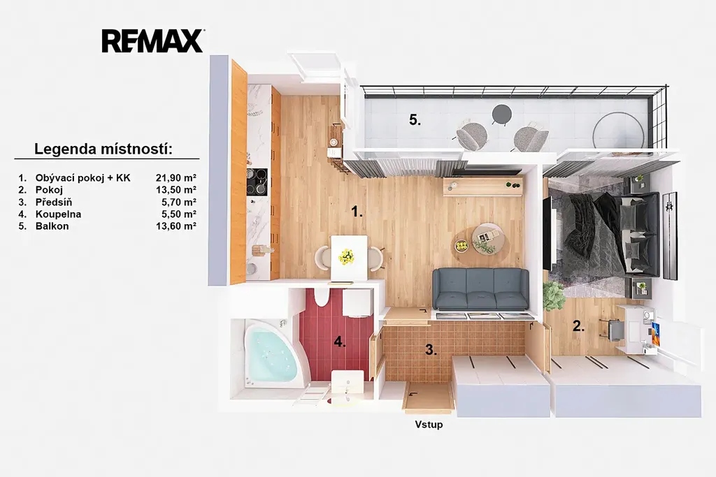 Byt se nachází v pátém nadzemním podlaží bytového domu z roku 2014. Dispozice je praktická, přehledná a ideálně využitelná pro každodenní život. Při vstupu do bytu oceníte velikou předsíň, přičemž po Vaší levici se nachází koupelna s toaletou. Hlavní obytný prostor pak tvoří obývací pokoj s kuchyňským koutem a spolu s tím samostatná ložnice. Součástí bytu je také balkon o opravdu štědré výměře 13,6 m² a dále sklep (4.5 m²). Veškeré orientační výměry jednotlivých místností jsou k náhledu v přiloženém půdorysu.