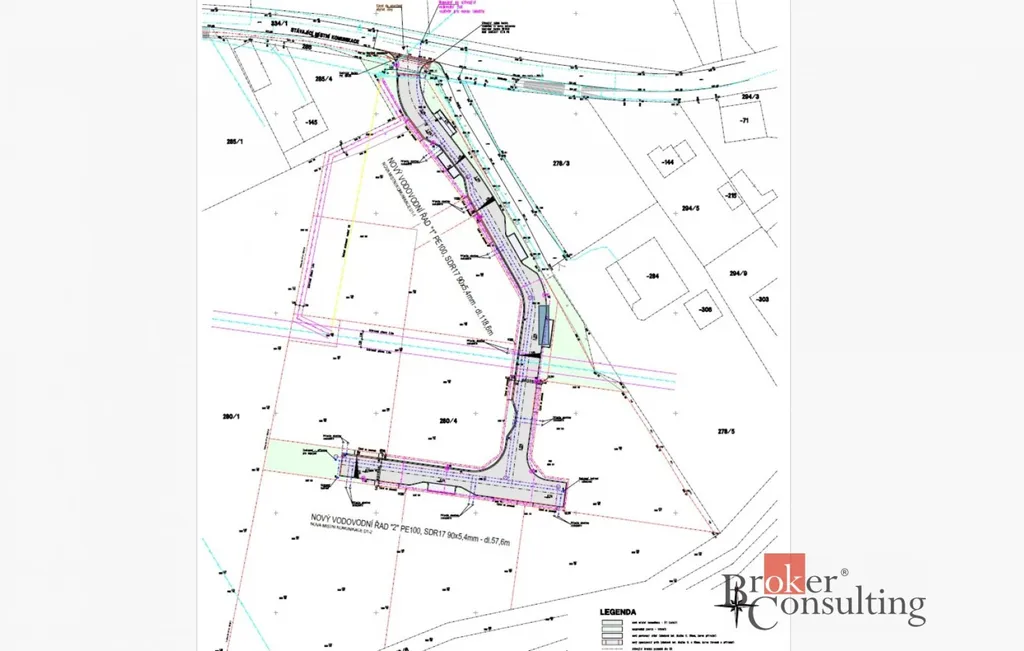 K pozemku vede nová asfaltová komunikace s veřejným osvětlením. Elektřina a veřejný vodovod jsou dostupné v přípojkách zřízených na pozemku. Odpad řeší budoucí majitel v rámci stavebního povolení přes vlastní ČOV s napojením do dešťové kanalizace.