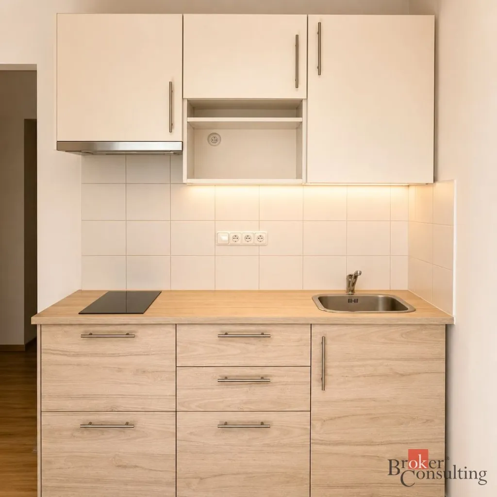 Byt je nabízen jako nezařízený, součástí je však menší lednice, indukční varná deska a pračka. Dispozice bytu nabízí praktické a funkční bydlení vhodné zejména pro jednotlivce.