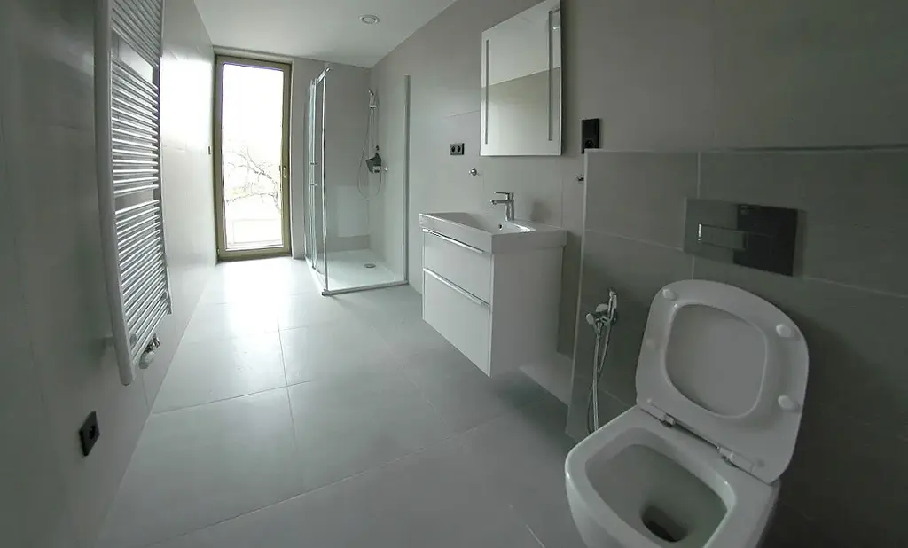 Koupelna s oknem: Koupelna je díky oknu přirozeně prosvětlená a disponuje velkým sprchovým koutem.
