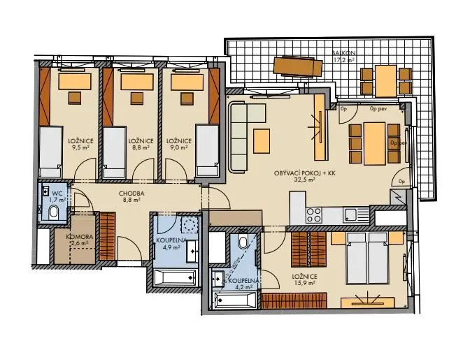Bytová jednotka 5+kk o velikosti 105,8 m2 s balkonem o velikosti 17,2 m2 se nachází v 9. nadzemním podlaží (z celkových dvanácti) s orientací na východ.