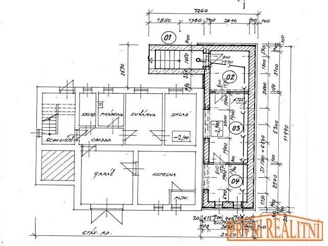 suterén – schodiště, chodba, 6 sklepních místností, kotelna, garáž, prádelna