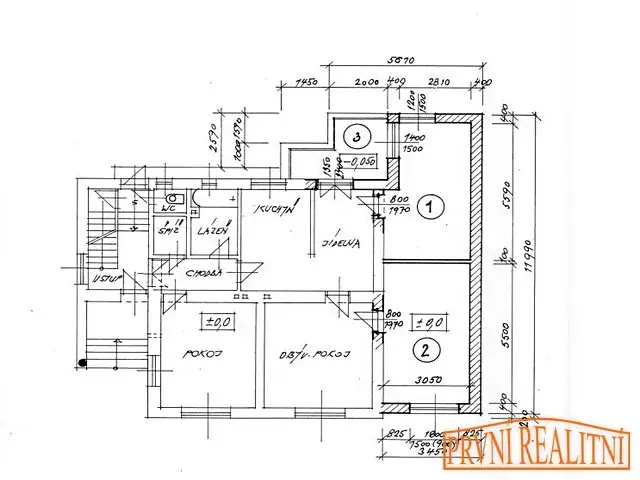 přízemí – chodba, 4 pokoje, kuchyně s jídelnou, spíž, koupelna, WC a terasa