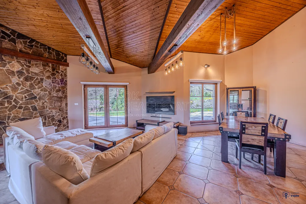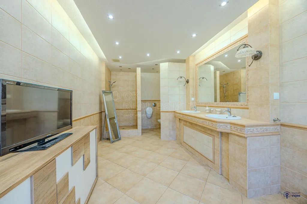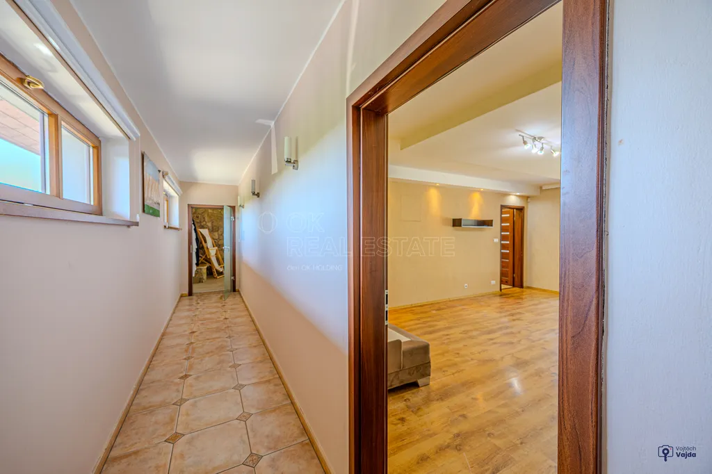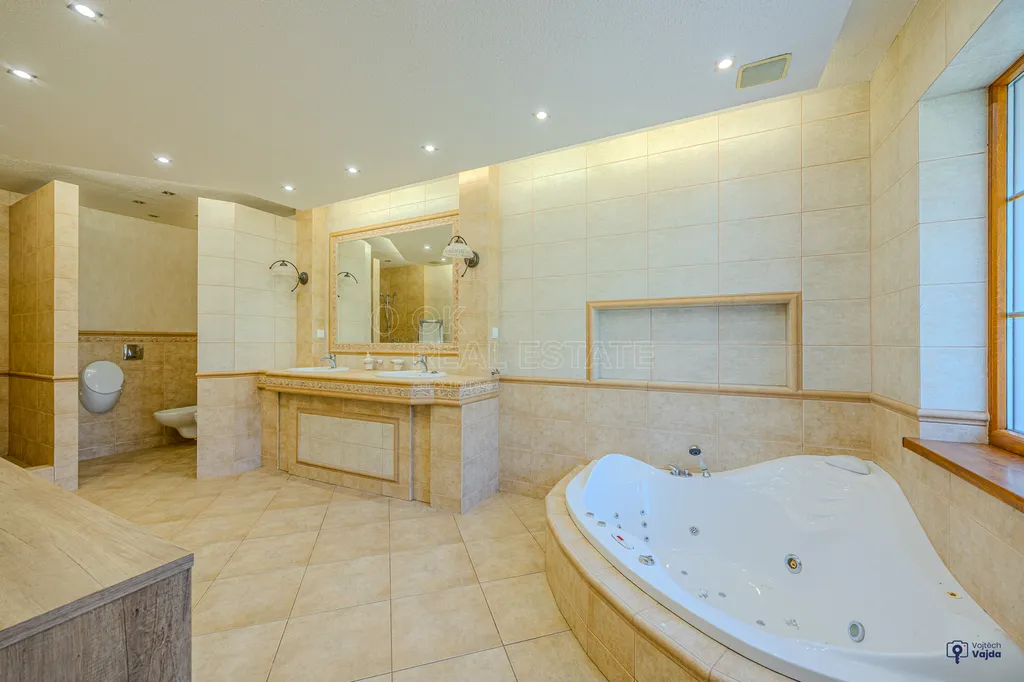 Dům je vybaven garáží pro čtyři auta a dostatečným počtem parkovacích stání, což vám zajistí komfort a pohodlí. A pokud si rádi udržujete kondici, jistě oceníte soukromou posilovnu přímo v domě. Pro relaxaci a odpočinek je k dispozici sauna a vnitřní bazén, které vám zpříjemní volné chvíle po náročném dni. V zimních měsících si můžete užívat teplo u krbu, který přidá na útulnosti domova.