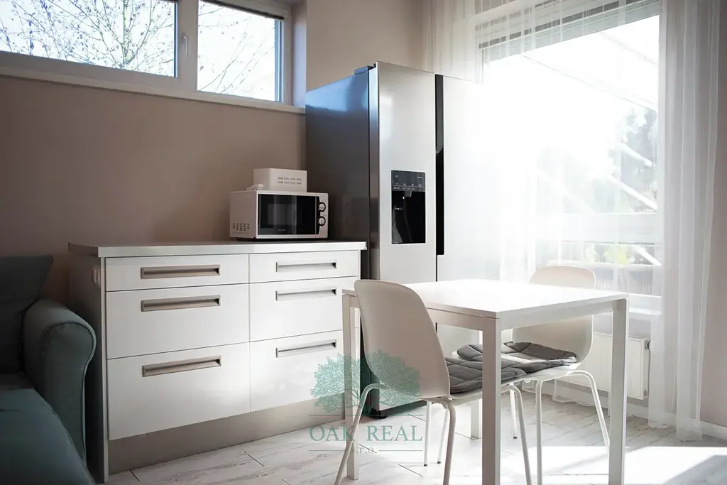 Byt se nachází ve zvýšeném nadzemním podlaží a díky okolní zeleni poskytuje dostatek soukromí jak v interiéru, tak na zahradě. Dominantou bytu je obývací pokoj s jídelní částí a plně vybaveným kuchyňským koutem, ze kterého je přímý vstup na zahrádku. Okna i dveře jsou vybaveny venkovními elektrickými roletami, vstup na zahradu navíc doplňuje síť proti hmyzu a vnitřní žaluzie.