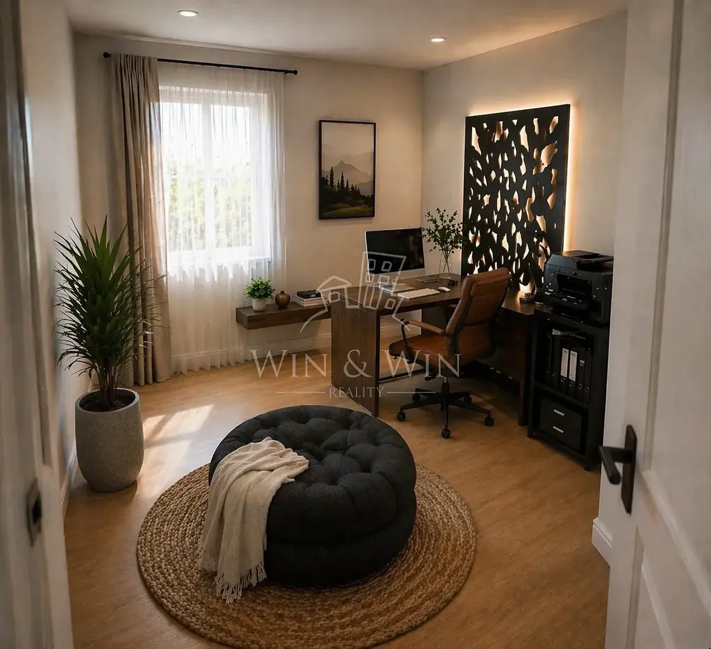 Dispozice je navržena prakticky – v přízemí vstupní zádveří, pokoj/pracovna, koupelna, samostatné WC a prostorný obývací pokoj s kuchyní a vstupem na zahradu. V patře se nachází dva pokoje, ložnice se šatnou a koupelna s toaletou.