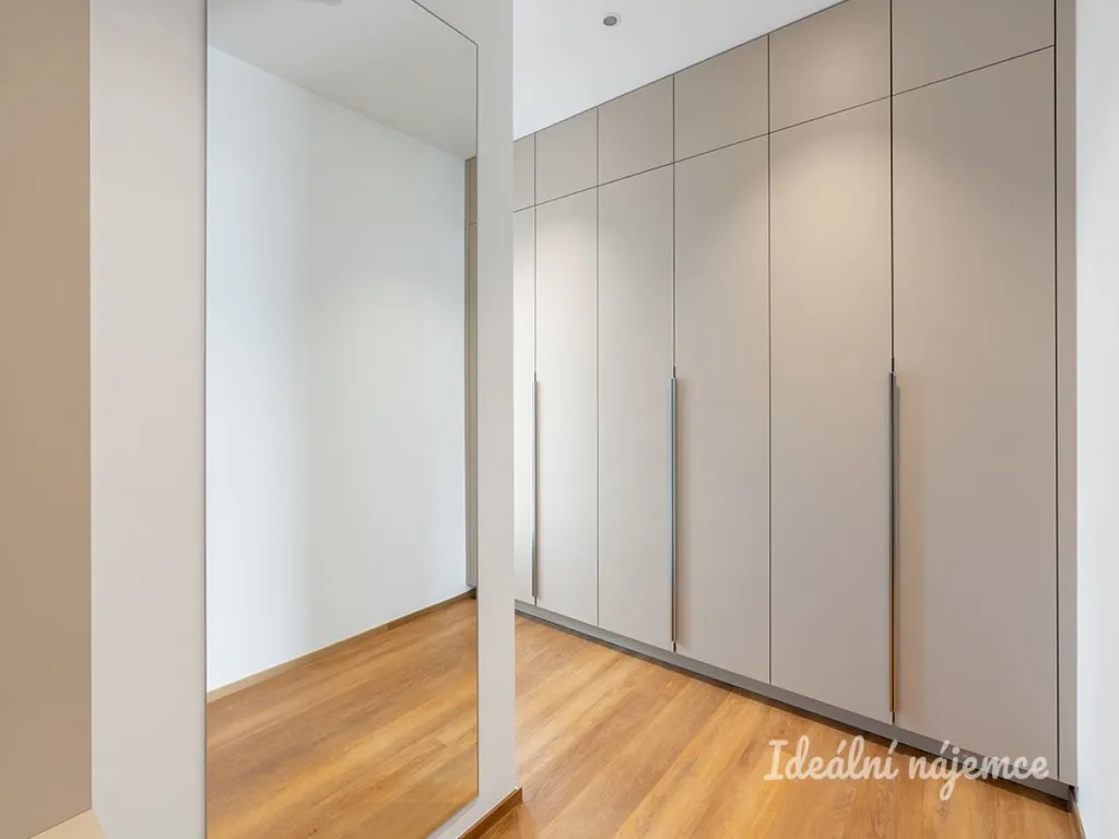 Nabízí se částečně zařízen. Kuchyně disponuje vestavěnými spotřebiči - lednice s mrazákem, myčka nádobí, elektrická trouba, indukční varná deska a digestoř. Obývací pokoj se nabízí bez vybavení.