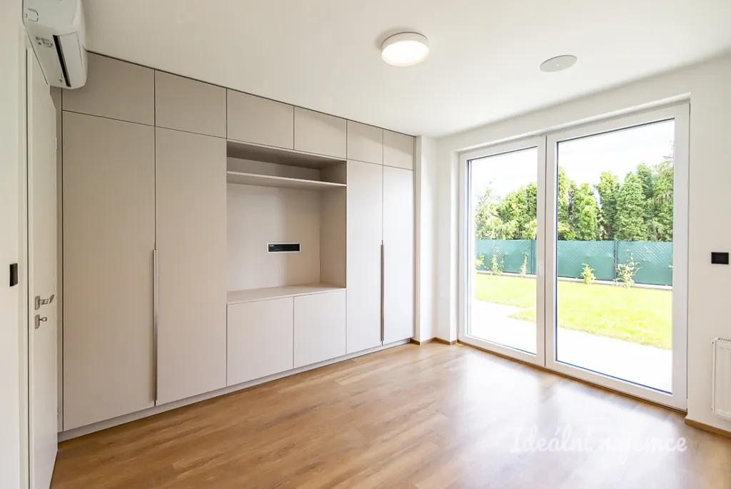 Z obývacího pokoje se dostaneme na zahradu s dlážděnou terasou. Ta je přístupná i z ložnice, ve které najdeme prostornou šatní skříň s prostorem na televizi. Koupelna nabízí mimo vanu, pračku a sušičku.