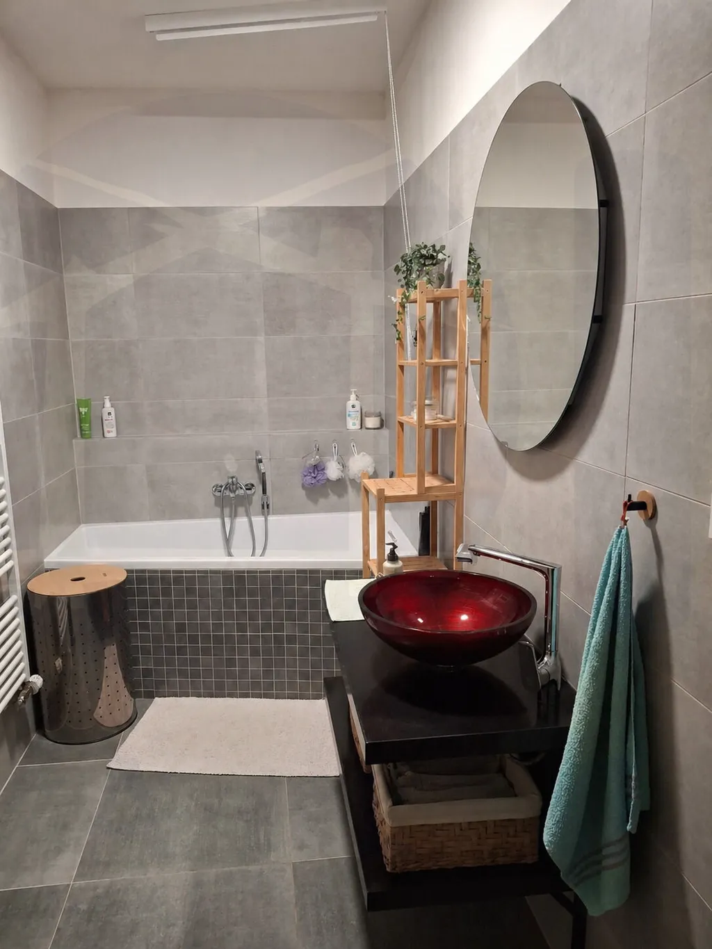 V koupelně je pro maximální komfort instalováno podlahové vytápění, doplněné o elektrický topný žebřík, který oceníte zejména v chladnějších měsících.