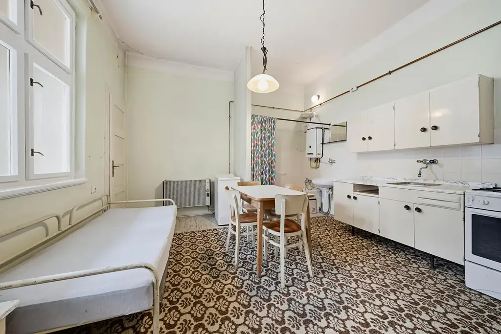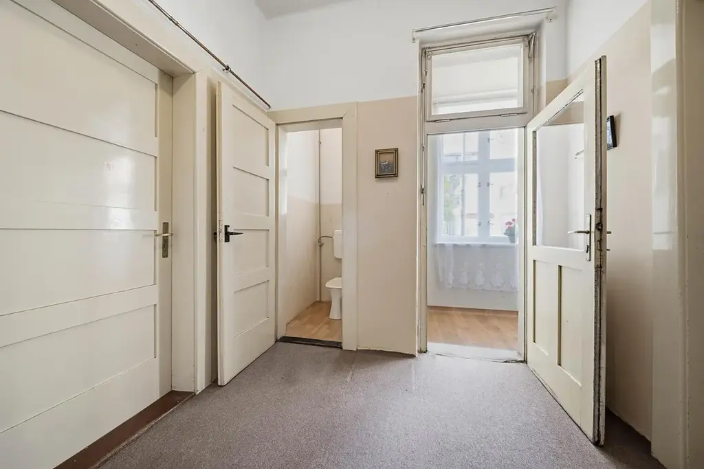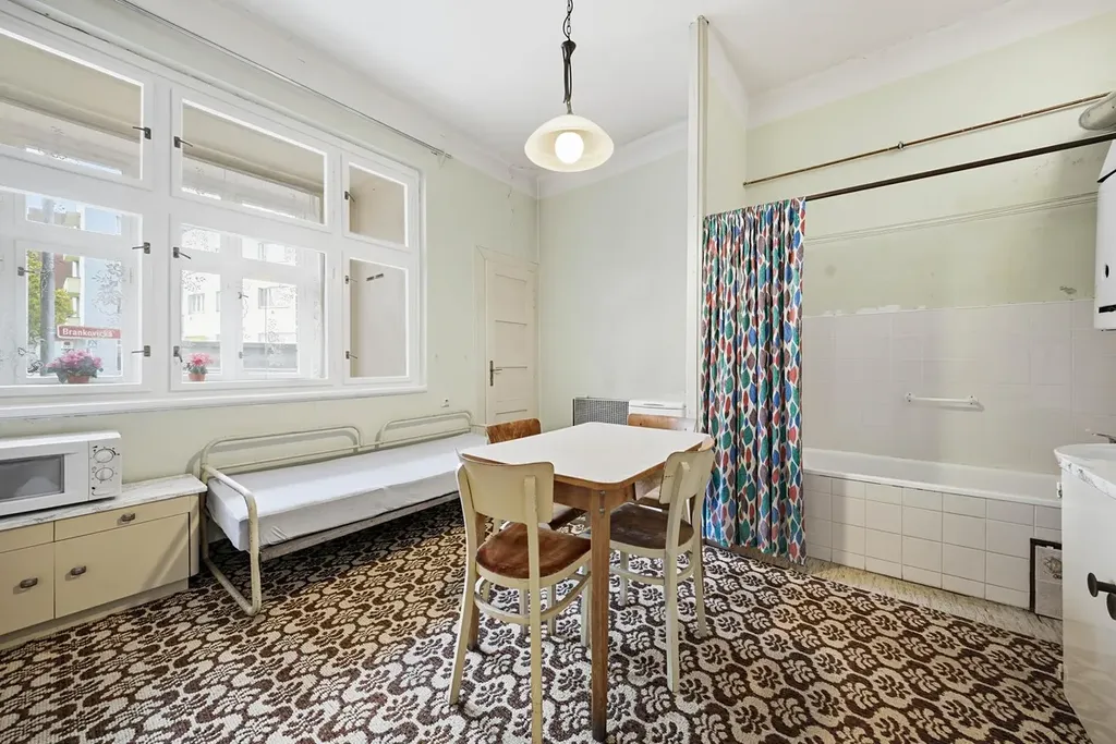 Dispozice bytu nabízí vstupní předsíň, ze které je přístup do samostatného pokoje a kuchyně s jídelním koutem. Dále je k dispozici toaleta a praktická spíž. Byt je v původním stavu, což nabízí ideální příležitost k rekonstrukci dle vlastních představ. V původním řešení byla koupelna součástí kuchyně, což je možné při rekonstrukci upravit a modernizovat.