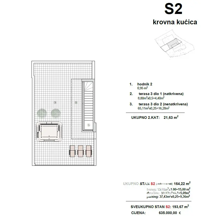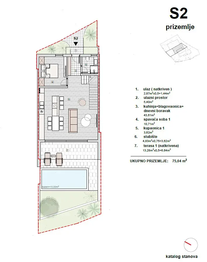 Konkrétně jednotka S2 disponuje celkovou netto užitnou plochou 193,67 m², z toho 164,22 m² obytné plochy. V přízemí o velikosti 75,04 m² se nachází vstupní část, ložnice, koupelna a prostorný obývací prostor s kuchyní a jídelnou. Velká posuvná prosklená stěna propojuje interiér s krytou terasou o velikosti 13,28 m² a otevírá výhled do zahrady s vyhřívaným bazénem o velikosti 15 m² a sluneční terasou.