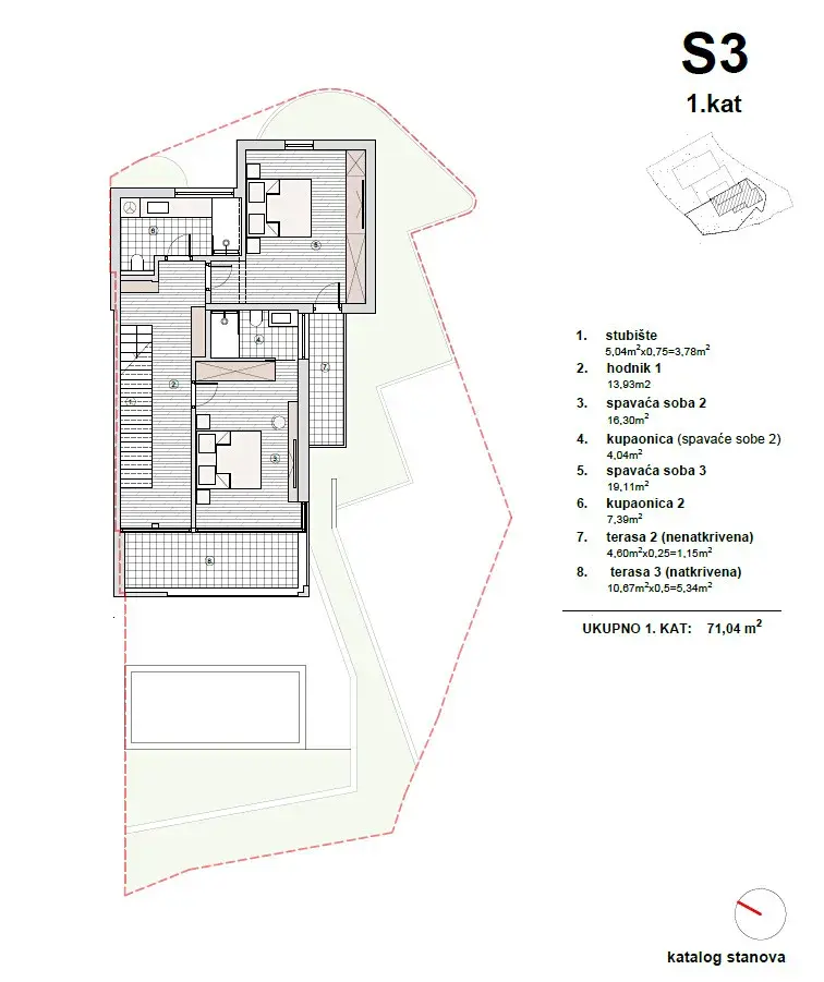 První patro nabízí hlavní ložnici s vlastní koupelnou a krytou terasou, další ložnici s vlastní venkovní terasou a samostatnou koupelnu. Vrcholem celé nemovitosti je střešní terasa o velikosti 22,46 m², která poskytuje panoramatický výhled na moře a okolní krajinu. Díky připraveným přípojkám na vodu a elektřinu zde lze vytvořit letní kuchyni, lounge zónu nebo soukromé wellness místo pod širým nebem.