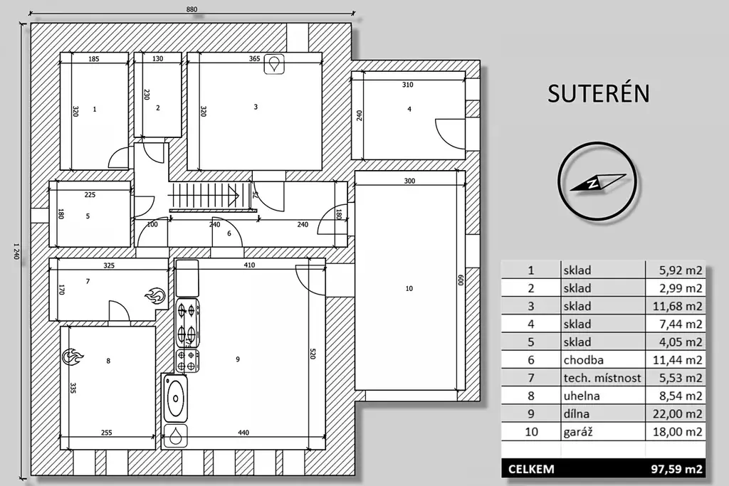 V suterénu (98 m2) se nachází garáž, dílna/výrobna, kotelna s technickým zázemím pro TČ a FVE a čtyři sklepní prostory.