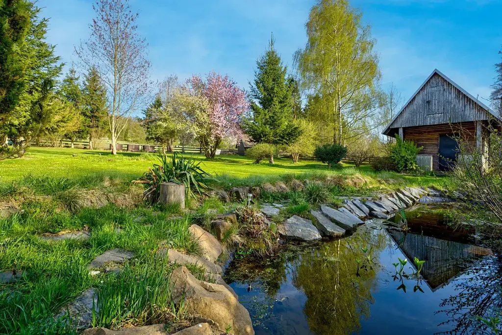Zahrada je skoro rovinná, jsou zde vzrostlé okrasné keře a stromy, zahradní jezírko, kryté venkovní posezení a přístřešek na auto. Zahradní domek slouží k letnímu využití pro hosty nebo v zimě na uskladnění zahradního nábytku a nářadí.