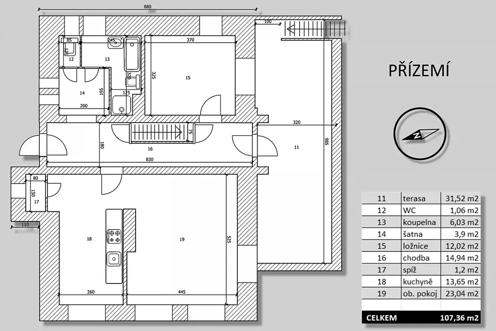 V přízemí (76 m2 + terasa 32 m2) je světlý obývací pokoj s kuchyní a spíží, ložnice, koupelna, wc a terasa orientovaná na jižní stranu s krásným výhledem na zahradu.