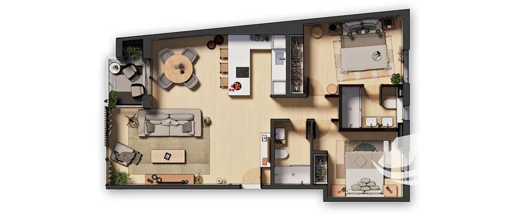 Dominantou tohoto penthousu je velkorysý obývací prostor s kuchyní v otevřeném konceptu, který plynule přechází na prostornou terasu. Ta nabízí ideální zázemí pro relaxaci, soukromé večeře pod širým nebem i stylová setkání s přáteli, a zároveň poskytuje pocit exkluzivity a úniku od ruchu města. Velkoformátová okna zajišťují dostatek denního světla a umocňují vzdušnost celého interiéru.