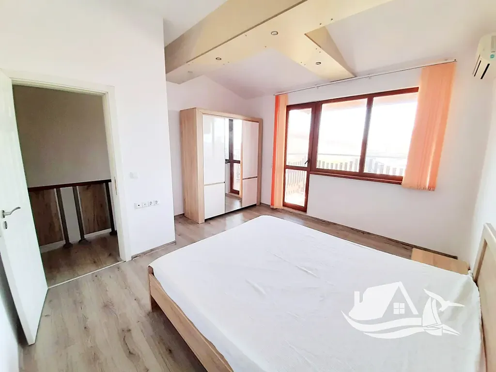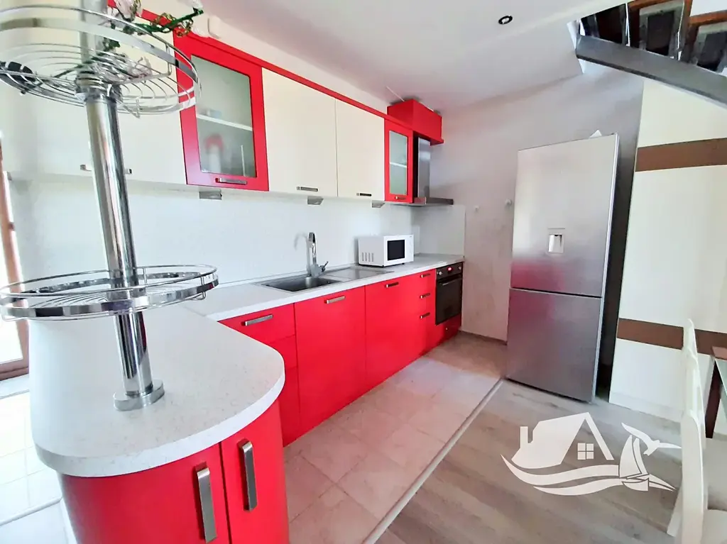 Představujeme Vám jedinečnou nabídku – dvoupodlažní městský dům typu townhouse v uzavřeném rezidenčním komplexu v klidném přímořském městečku Byala. Nemovitost spojuje komfort moderního bydlení s tradiční bulharskou architekturou – červené tašky na střeše, dřevěné balkony a prostorné panoramatické prosklení v obývacím pokoji. O útulnou atmosféru se stará i krb obložený přírodním kamenem.