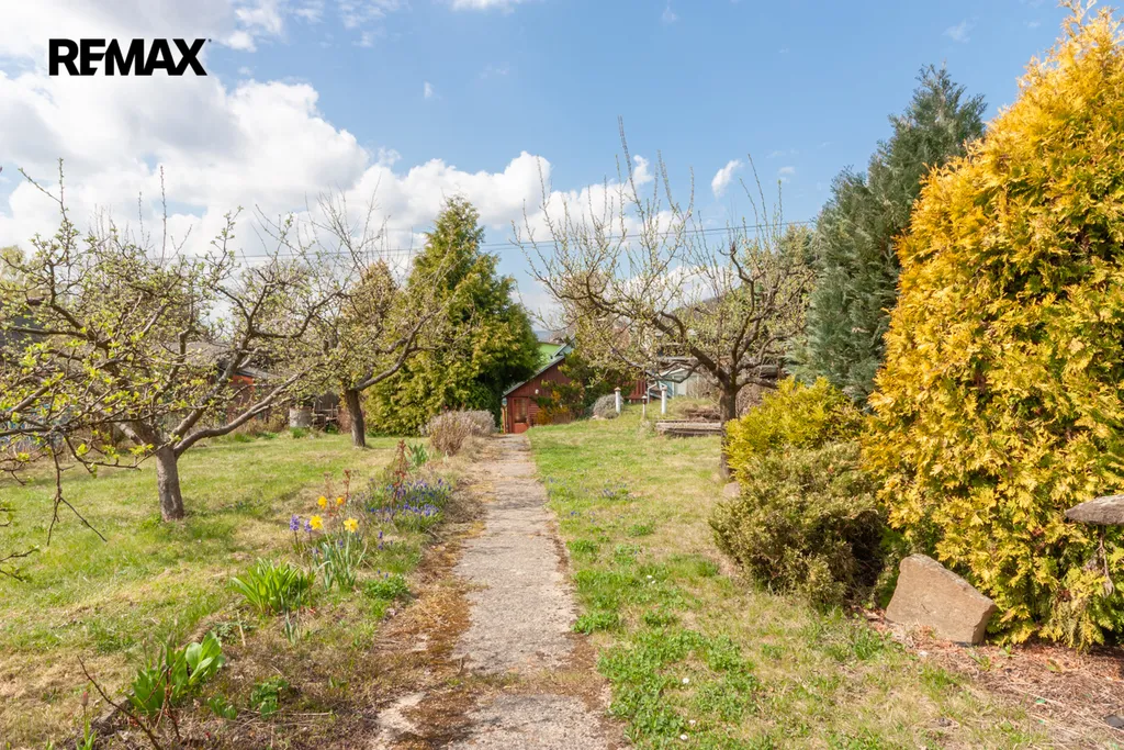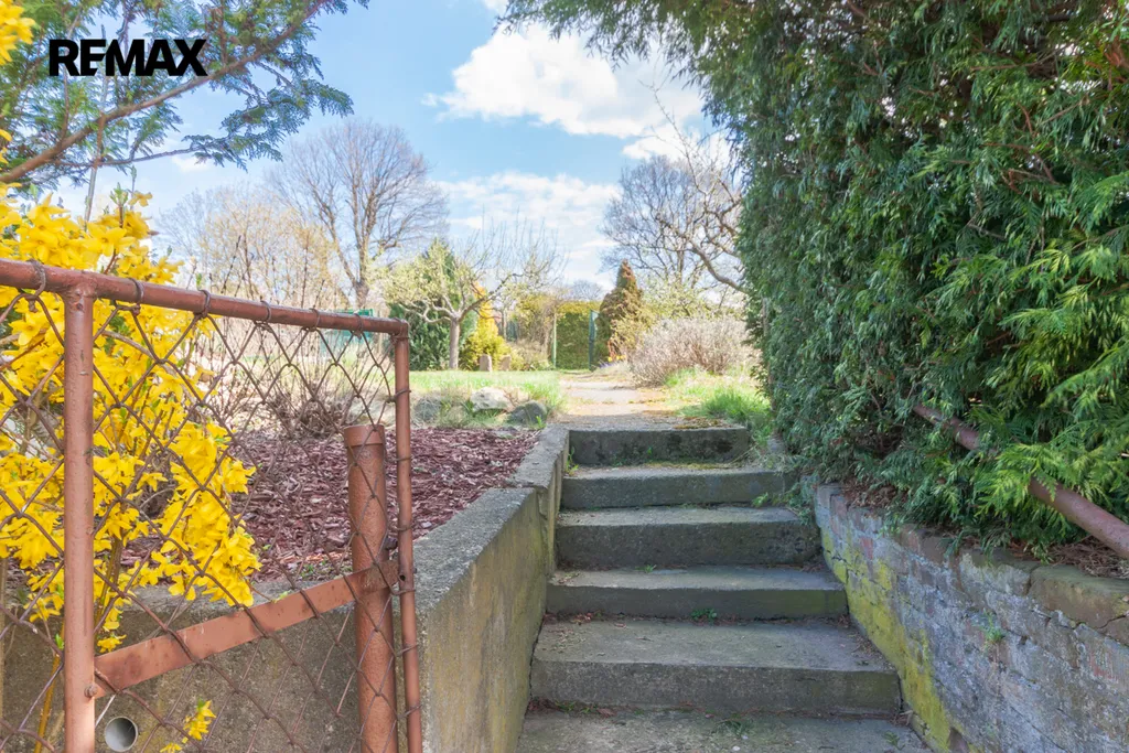 Součástí zahrady je zahradní nepodsklepená chata s podkrovím. V přízemí je veranda, víceúčelová místnost s kuchyňským koutem, šatna a schodiště do podkroví. V podkroví je místnost využívaná jako ložnice. Na chatu navazuje místnost na zahradnické nářadí. Naproti chatě je do terénu usazený velmi kvalitní sklep, kde vám ovoce i zelenina vydrží od podzimu až do pozdního jara. Vedle sklepu je místnost s lázeňským kotlem k osprchování.