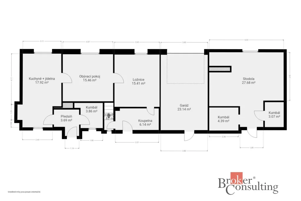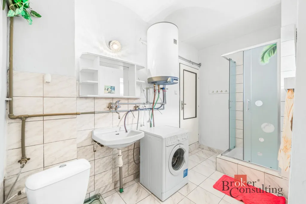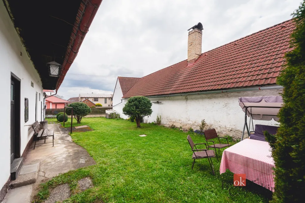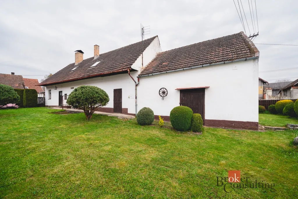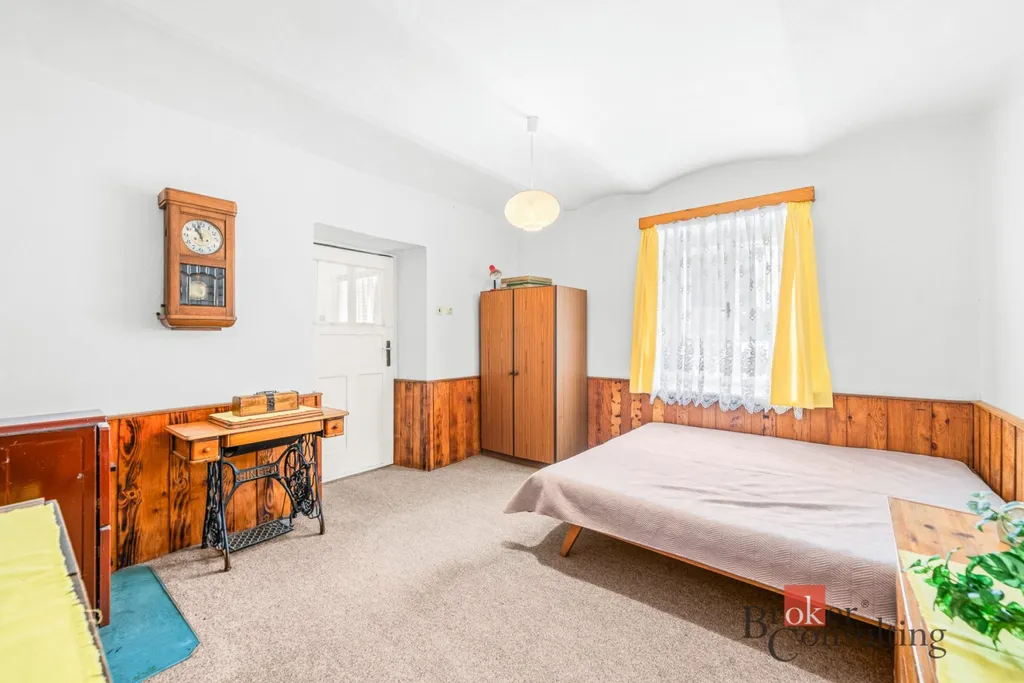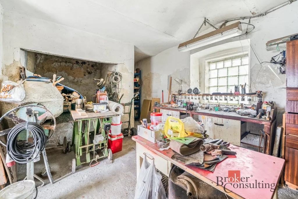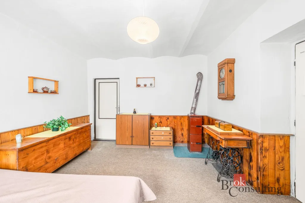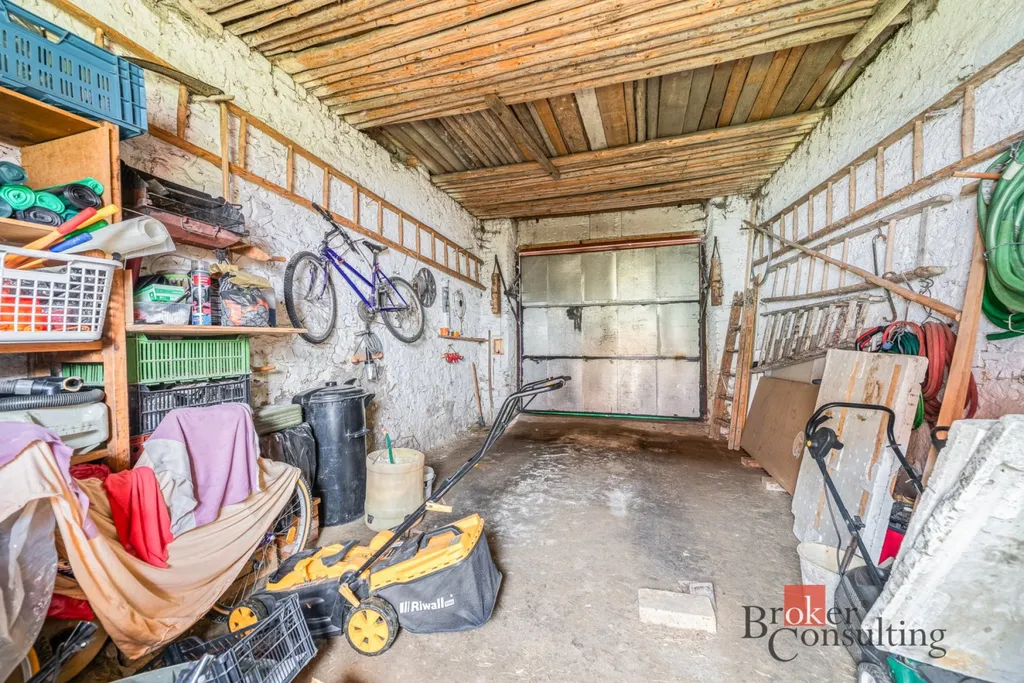 V přízemí se nachází vstupní předsíň, navazující kuchyně s jídelnou, samostatný obývací pokoj, ložnice, koupelna, komora a praktické zázemí domu. Součástí je také garáž, stodola a další hospodářské či skladovací prostory, které výrazně rozšiřují potenciál nemovitosti – ať už pro dílnu, podnikání, rekreační využití nebo další přestavbu.