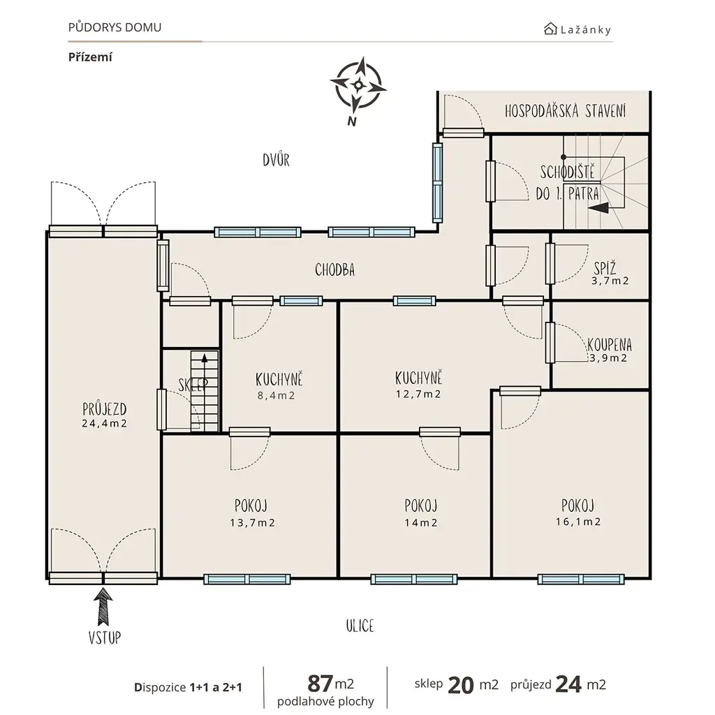 • dispozici vhodnou jak pro rodinné bydlení, tak i třeba rekreační využití nebo podnikání