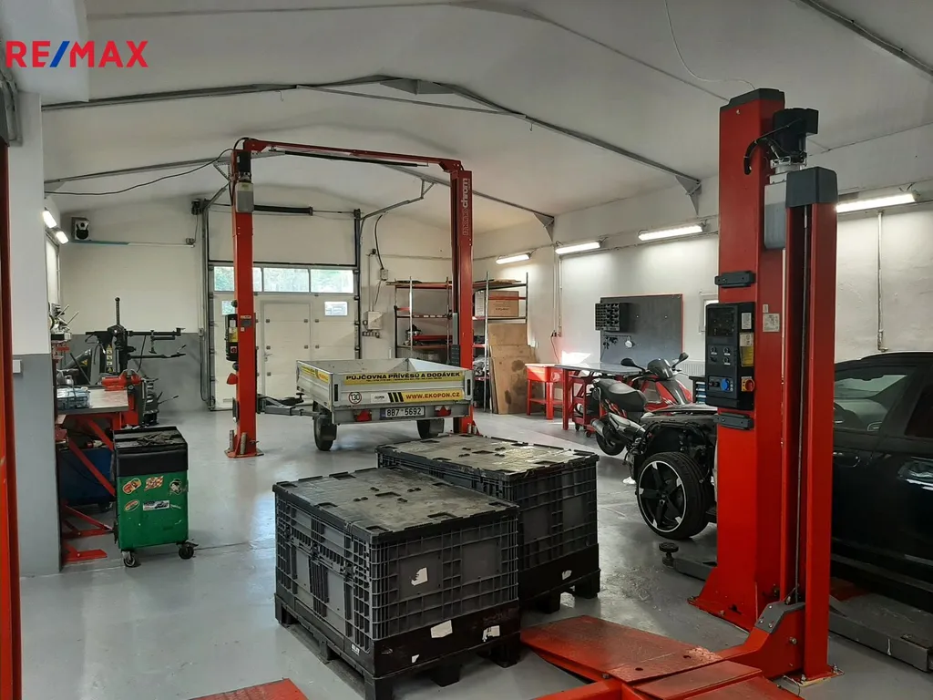 Dále se na pozemku nachází autoservis – o zastavěné ploše 233 m2, jehož vnitřní řešení je následující: pneuservis / měření emisí 64 m2, sklad maziv 7,5 m2, kancelář 13 m2, autoservis 129 m2, WC, sprcha, šatna 15 m2. Jeho vybavení představuje 4x dvou sloupový zvedák 4t, 1x čtyř sloupový zvedák + 3D podvozková geometrie, pneuservis, kompresor + tlaková nádoba 500l, plnička klimatizací, rozvod vzduchu po celé dílně, ponky, kompletní sortiment ruční, elektrické, pneumatické nářadí, sociální zázemí (sprcha, WC, relax zóna), kancelář vč. vybavení (PC, tiskárna, skener), kamerový systém, ústřední vytápění, 2x garážová sekční vrata výška 2,7m na DO, volná parkovací plocha pro cca 30 vozidel.